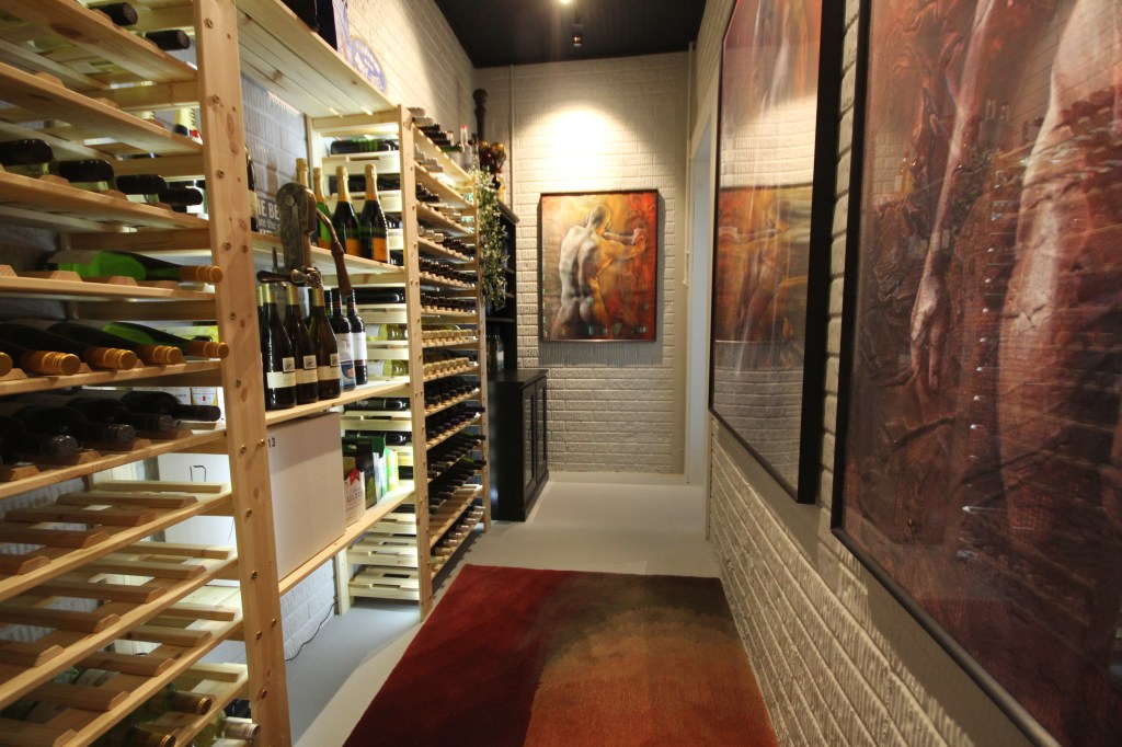 Three gallons of paint, leftover dining room cabinets and bathroom prints from the condo and new wine racks from Williams Sonoma and presto a previously unattractive space is transformed into… well an actual wine room. After all that’s what it says on the entrance door.