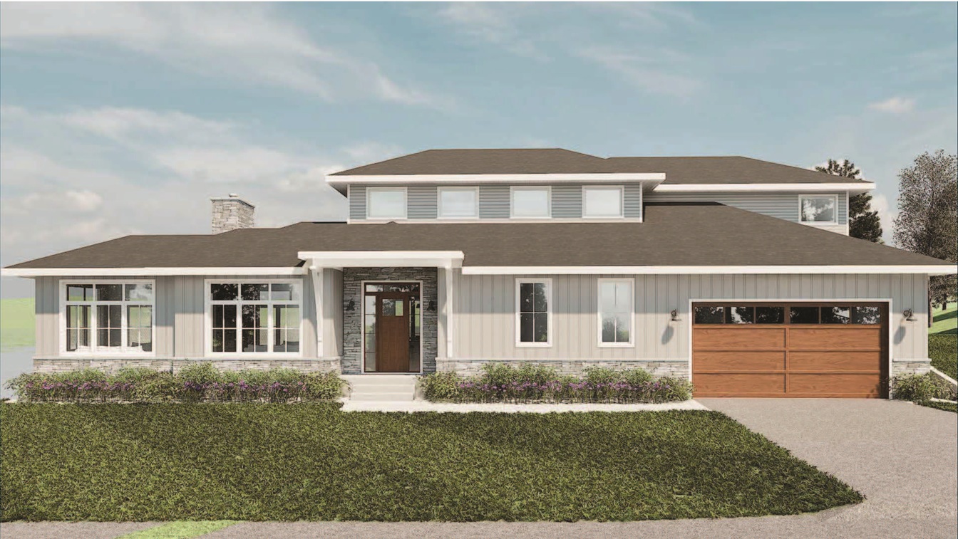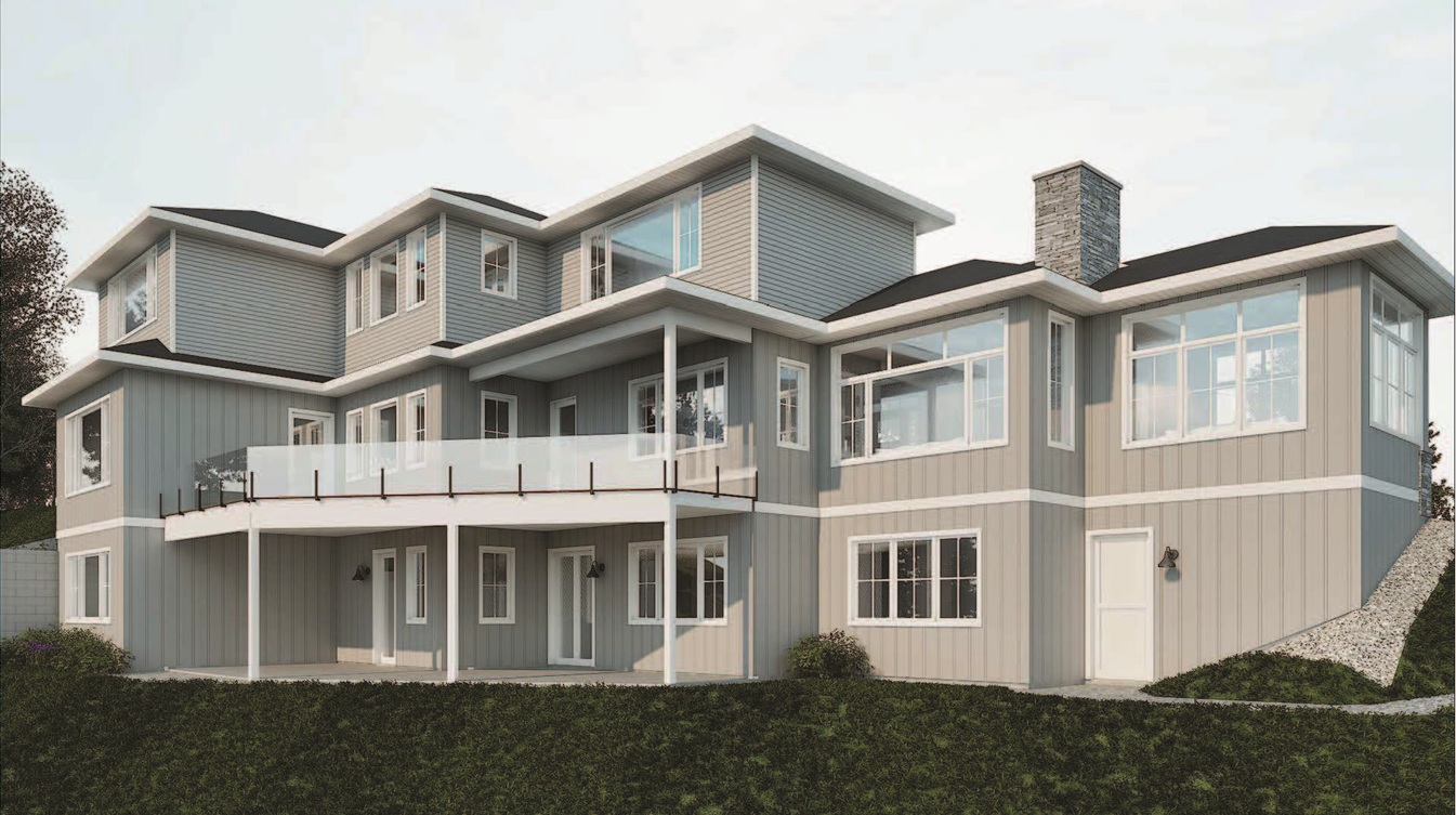 This is the renders for the first plan the architects came up with, a two story walkout, four bedrooms, three baths and a total of 3,400 square feet. I agree, it looks a bit choppy from the back but that is due to the building envelope looking like a triangle. The architect firm sent the plans out to three different contractors to see what the estimated cost would be.